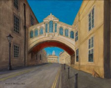 Oxford’s Bridge of Sighs – a link between parts of Hertford College. This view looks North towards the Sheldonian Theatre (Acrylics on 50 x 40 cm board, 2023)