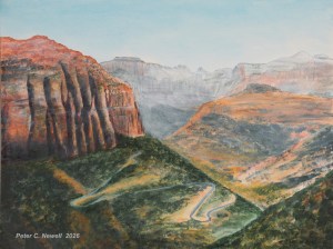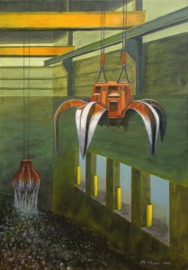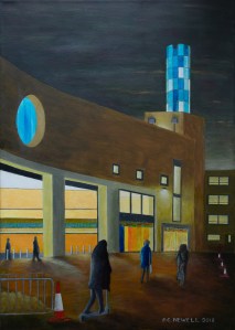 The revamped Westgate Shopping Centre in Oxford (opened in Oct 2017) fascinated me with its many escalators and levels. I noticed for one of the escalators that the cover of a supporting column was partly missing. This gave an unusual insight into the insides of the structure and which I retained in the painting because it added harmonising colours.