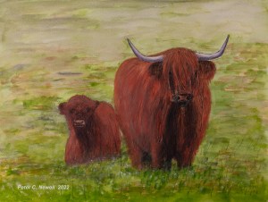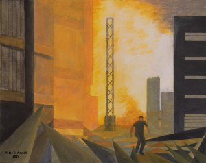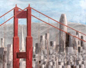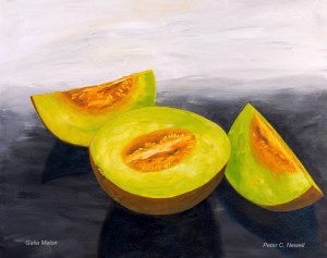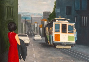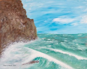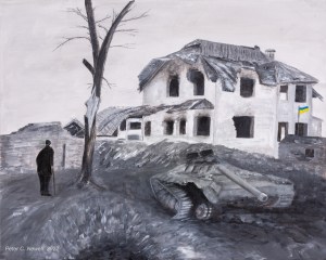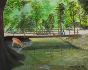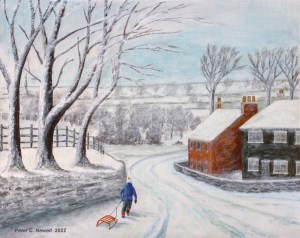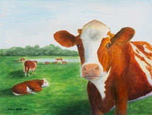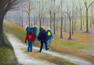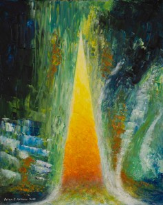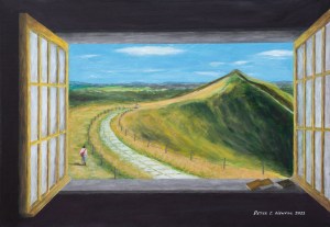 As a great admirer of Johannes Vermeer’s work, I have tried to create a scene such as he and his contemporaries in the 17th century might have painted but with links to the 21st century. The house is typically Dutch in character and lighting. Like some other Dutch paintings of the period, I have used a bunch of keys to indicate the key to understanding the picture. The laurel wreath near the keys is associated with Clio (the Muse for History in Greek mythology) who is shown being painted by Vermeer in his painting on the wall. (You can tell it is Clio because she is carrying a large book and by the clues left on the books on the floor in the foreground of the main painting). I show Vermeer from the rear as he painted himself in “The Art of Painting”. Although Vermeer is painting Clio, he is actually looking at a young 21st century girl in a white dress (which is also shown hanging on the wall to the left of my painting). To the left of the painting on the wall is a modern abstract picture with the same colours and design (in abstract) as seen in the painting to the right. Below it is the pair of white shoes that the girl wears in the picture. To link the 21st and 17th century I have added brushes in a pot – denoting art is the link.