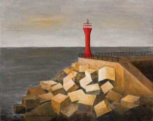 The painting shows a boat departing from the safety of home to go out to sea. The scene is mostly imaginary but based on elements taken from reality.
