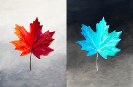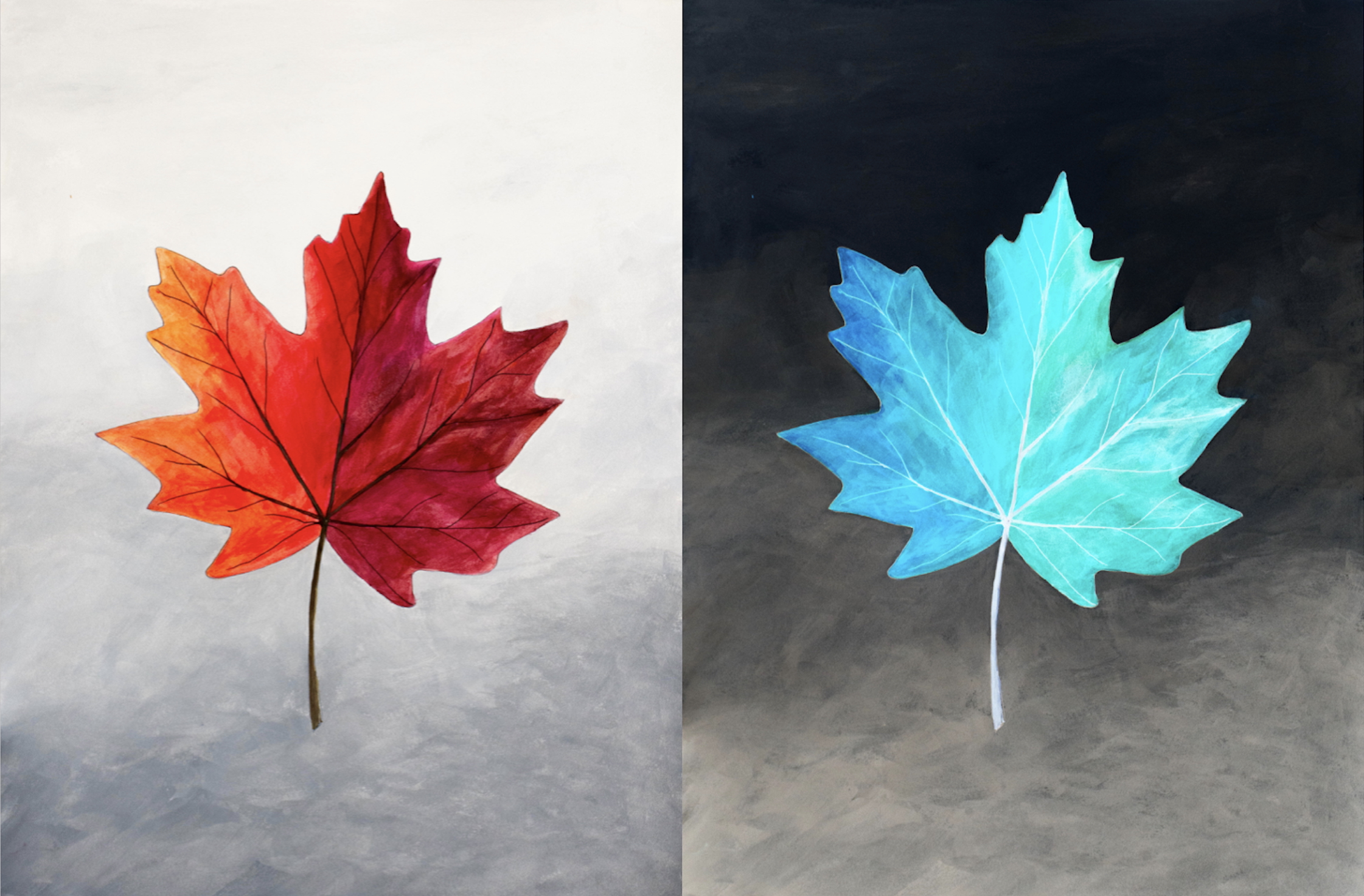 (Left) Maple leaf in CMYK acrylics. (Right) inverted image (i.e. complementary CMYK colours plus inversion of black and white)